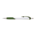 Plastová propiska s bílým tělem a barevným úchopem a klipem a stříbrnými doplňky