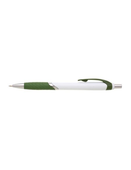 • plastová propiska s bílým tělem a barevnými úchopem a klipem, stříbrné doplňky