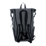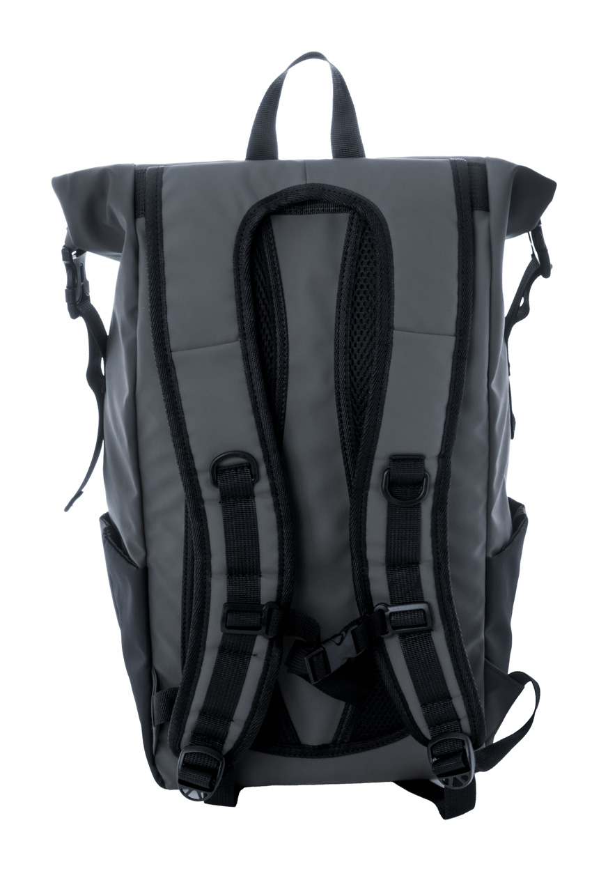 • vodotěsný rolovací batoh z RPET se zapínáním na přezku a suchý zip, polstrovaná přihrádka na notebook (16") a tablet (10"), přední kapsa na zip, boční kapsy, polstrovaná záda a ramenní popruhy, polyester 600D RPET potažený PU, s výrazným štítkem RPET