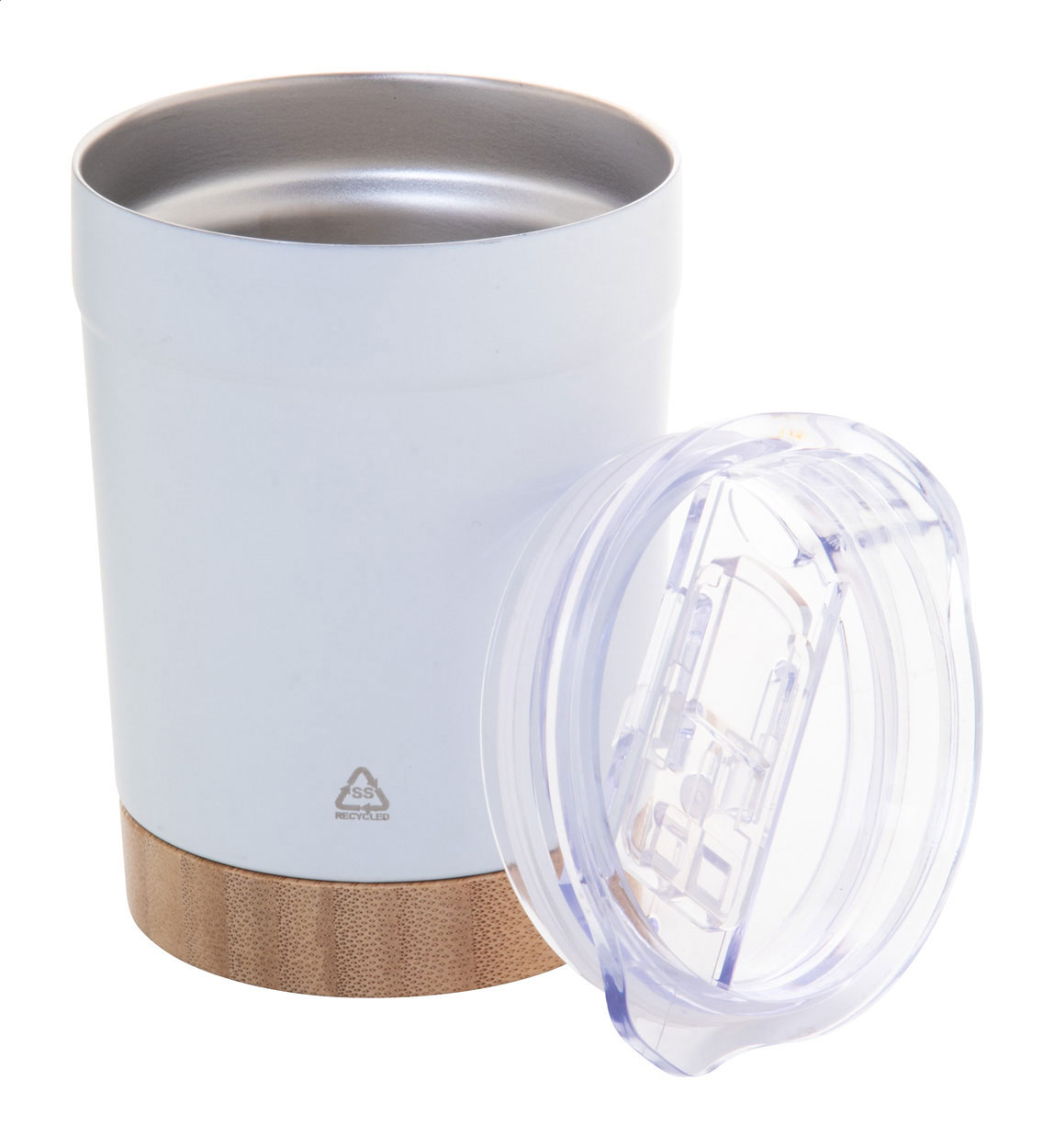 • Dvoustěnný vakuově izolovaný termo hrnek z recyklované nerezové oceli s bambusovým dnem a AS plastovým víčkem na pití, 300 ml