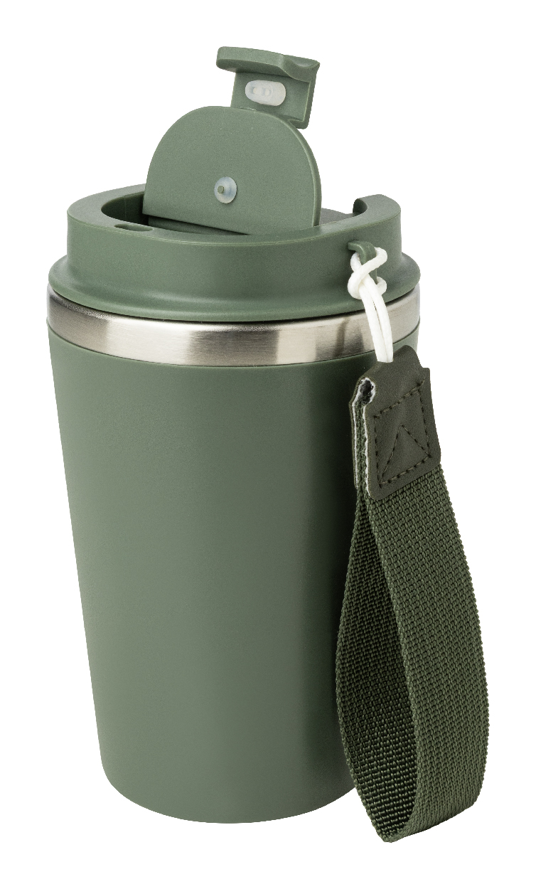• Dvoustěnný termo hrnek z recyklované nerezové oceli s vnějším PP plastem a víčkem na pití, s popruhem na přenášení RPET, 350 ml