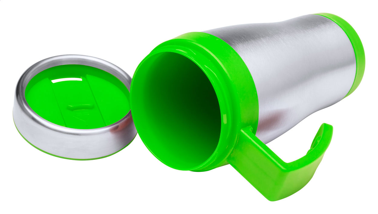 • Nerezový termo hrnek z nerez oceli s barevnými plastovými částmi a uchem, 450 ml.