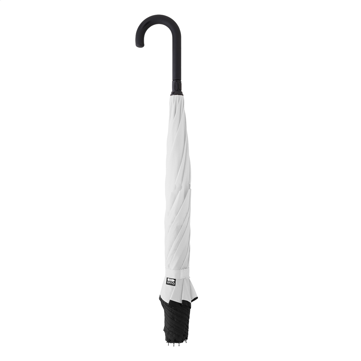 • Manuální větruodolný deštník s reverzním otevíráním, 8 panely, dvouvrstvou dvoubarevnou stříškou, kovovým rámem, žebry ze skelných vláken a pogumovanou rukojetí. Materiál: 190T RPET pongee. S výrazným štítkem RPET.