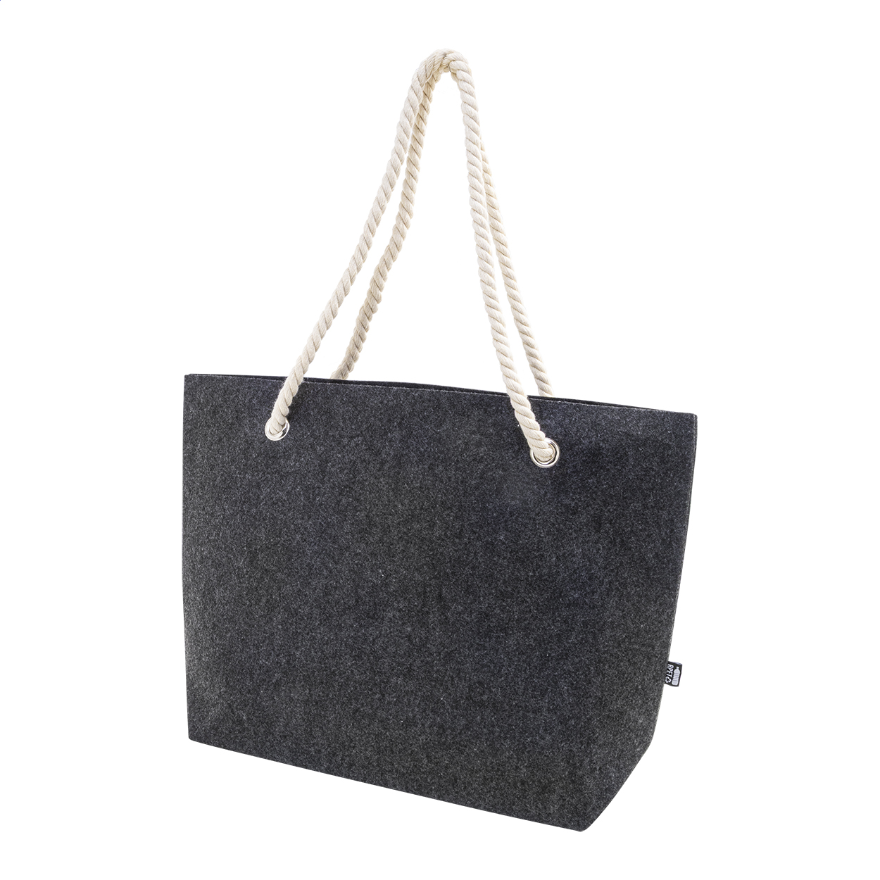 • Plážová nebo nákupní taška z RPET s bavlněnými šňůrkami a spodním klínkem. S výrazným štítkem RPET.
