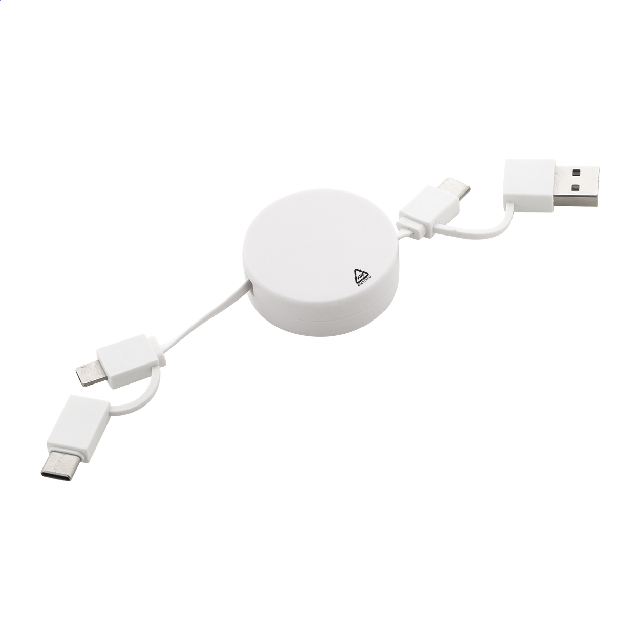 • Teleskopický USB nabíjecí kabel z recyklovaného hliníku. S konektory micro USB, USB-C a Lightning. Se vstupy USB a USB-C.