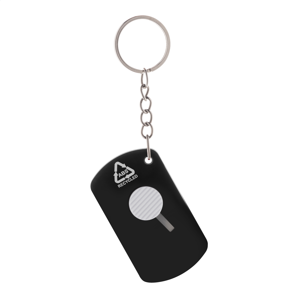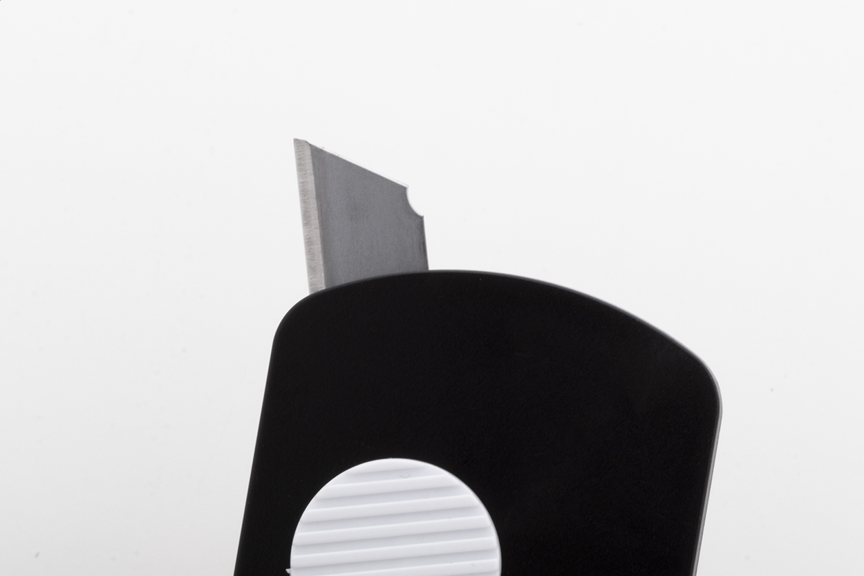 • Nůž na papír z recyklovaného ABS plastu a nerezové oceli se samonavíjecí čepelí a kovovým kroužkem na klíče.