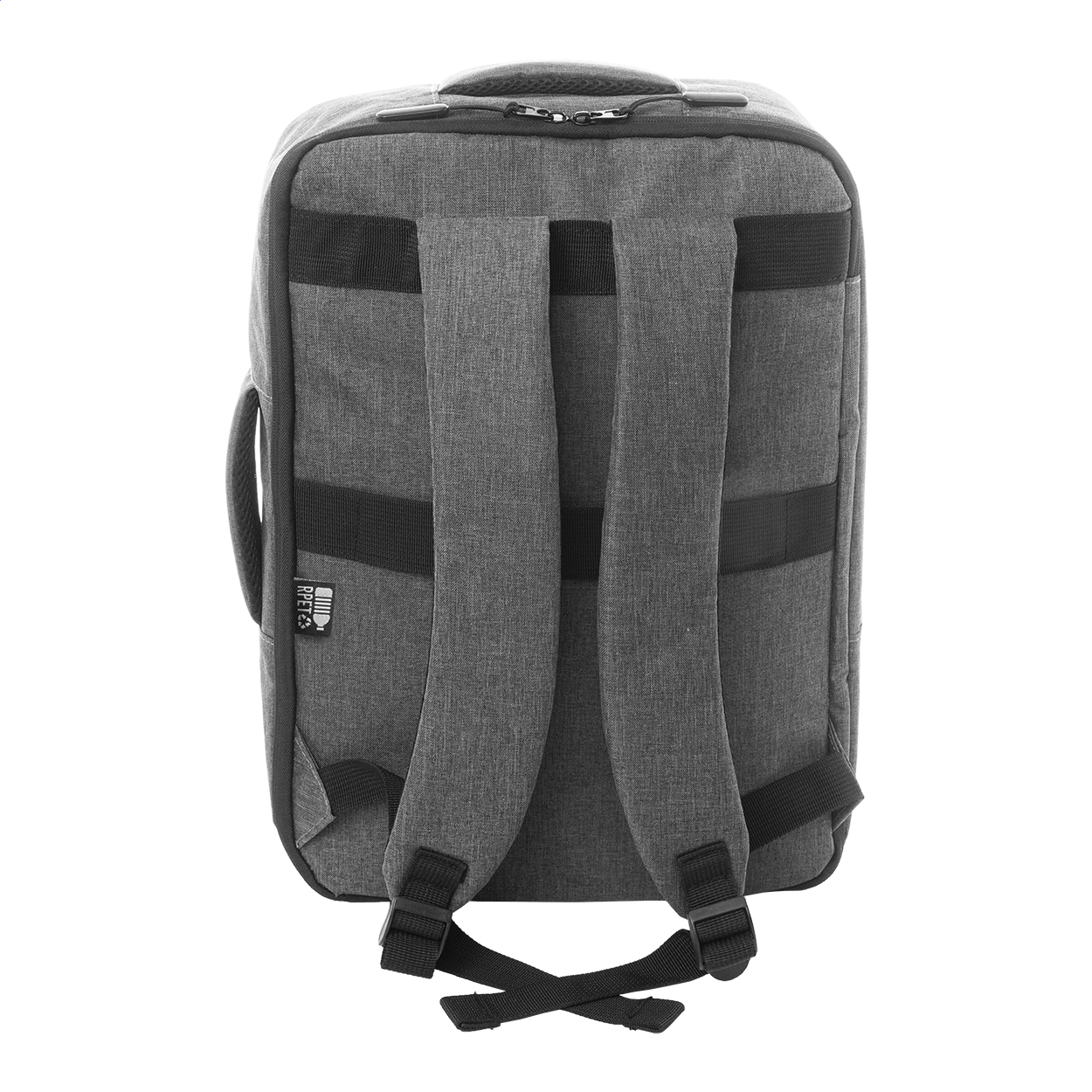 • Dvojfunkční RPET batoh a taška na dokumenty s přihrádkou na zip a polstrovanou přihrádkou na notebook (15"). S popruhem na vozík, polstrovanými zády a ramenními popruhy. Polyester 300D RPET, s výrazným štítkem RPET.