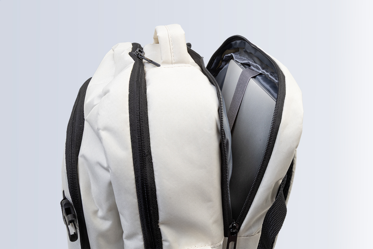 • Dvojfunkční RPET batoh a taška na dokumenty se 2 přihrádkami na zip, přední kapsou na zip a polstrovanou přihrádkou na notebook (15"). S kapsou proti krádeži, popruhem na vozík, polstrovanými zády a ramenními popruhy. Polyester 600D RPET, s výrazným štítkem RPET.