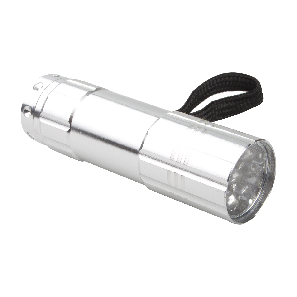 • Hliníková baterka s 9ti LED diodami s páskem kolem ruky. Včetně 3 AAA baterií.