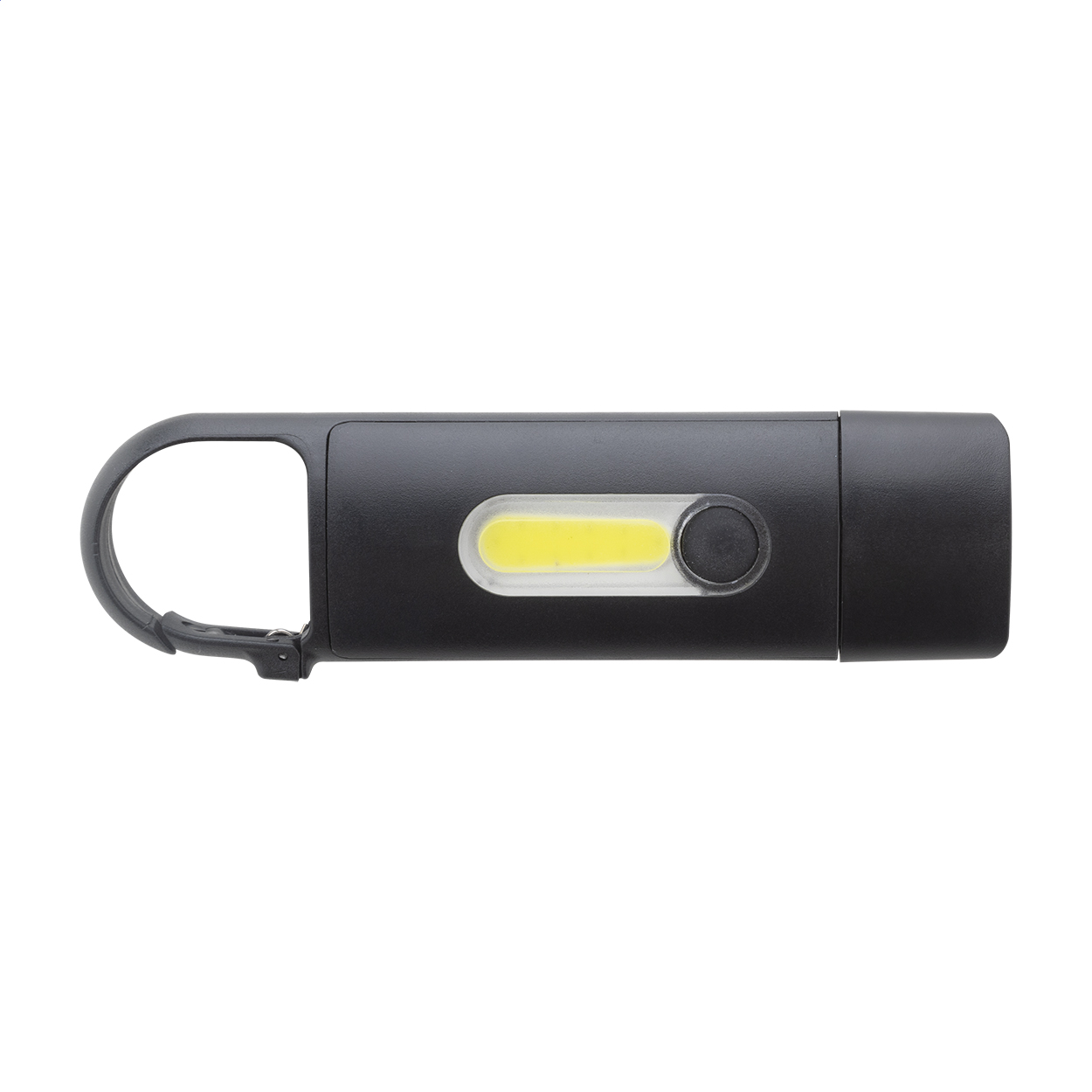 • Recyklovaná ABS mini baterka s vestavěnou USB dobíjecí baterií (200 mAh) a karabinou. S COB světlem u písma a COB reflektorem na straně. Se 3 režimy svícení. Včetně USB nabíjecího kabelu.