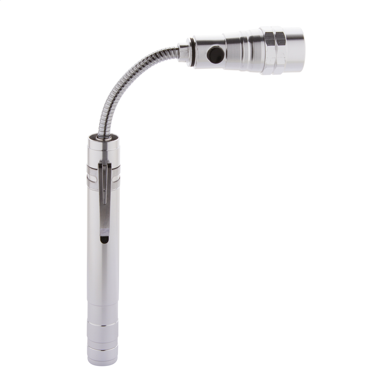 • 3 LED hliníková svítilna s výsuvnou a flexibilní hlavou, magnetem nahoře a kovovou boční sponou. Včetně knoflíkových baterií. Max. délka: 57 cm.