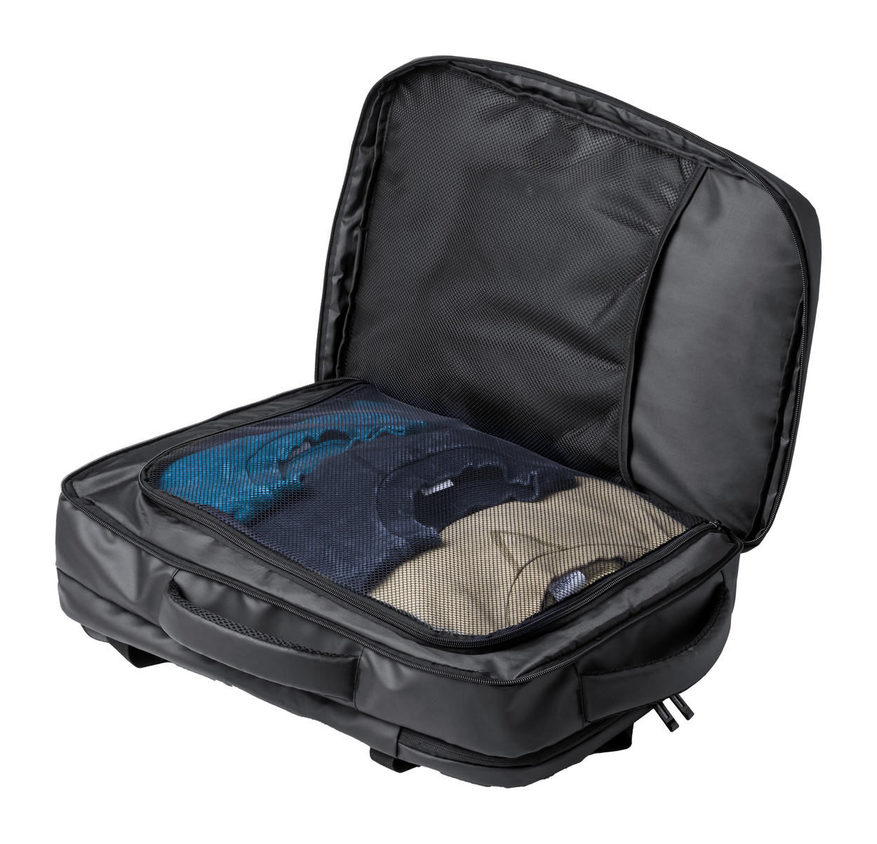 • dvoufunkční batoh a taška na dokumenty z PU kůže s přihrádkami na zip, polstrovanou přihrádkou na notebook (17") a síťovanou přihrádkou, popruhem na vozík, polstrovanými zády a ramenními popruhy