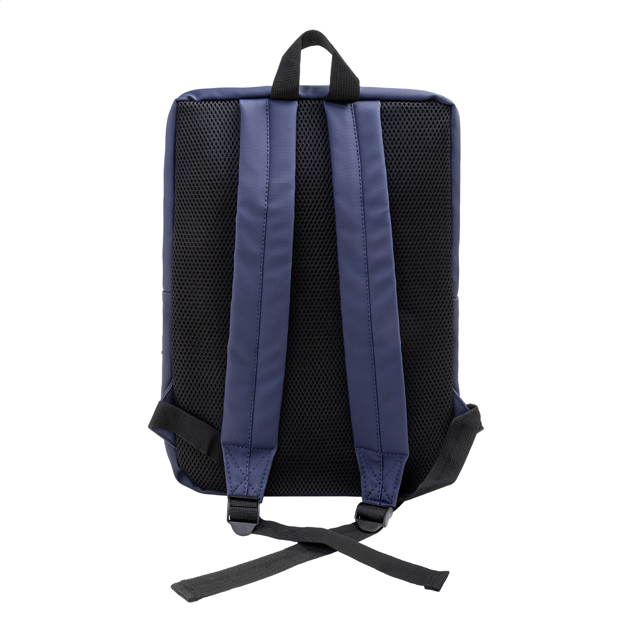 • Vodotěsný tenký batoh na notebook RPET s přihrádkou na notebook (15") na zip a přední kapsou na zip. S polstrovanými zády a ramenními popruhy. Polyester 600D RPET potažený PU, s výrazným štítkem RPET.
