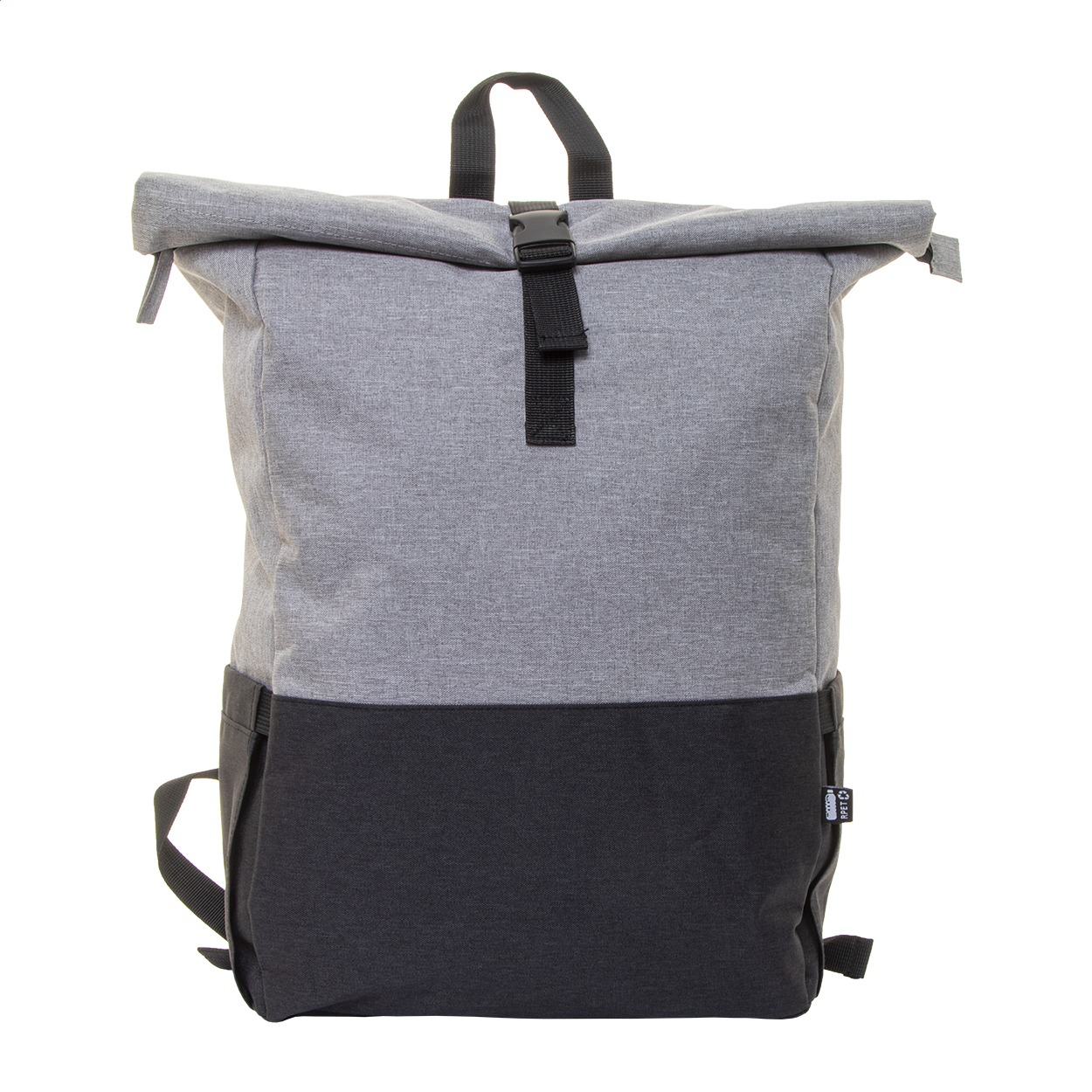 • Dvoubarevný rolovací batoh z RPET se zapínáním na přezku, hlavní přihrádka na zip, polstrovaná přihrádka na notebook (15") a tablet (10"), boční kapsy, polstrovaná záda a ramenní popruhy. 300D RPET polyester s výrazným štítkem RPET.