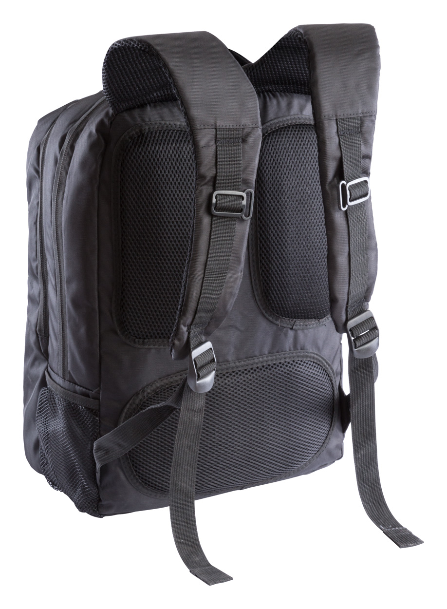 • batoh s mnoha přihrádkami na zip, vypolstrovanou přihrádkou na laptop (15"), vypolstrovanými zády a popruhy, 600D nylon