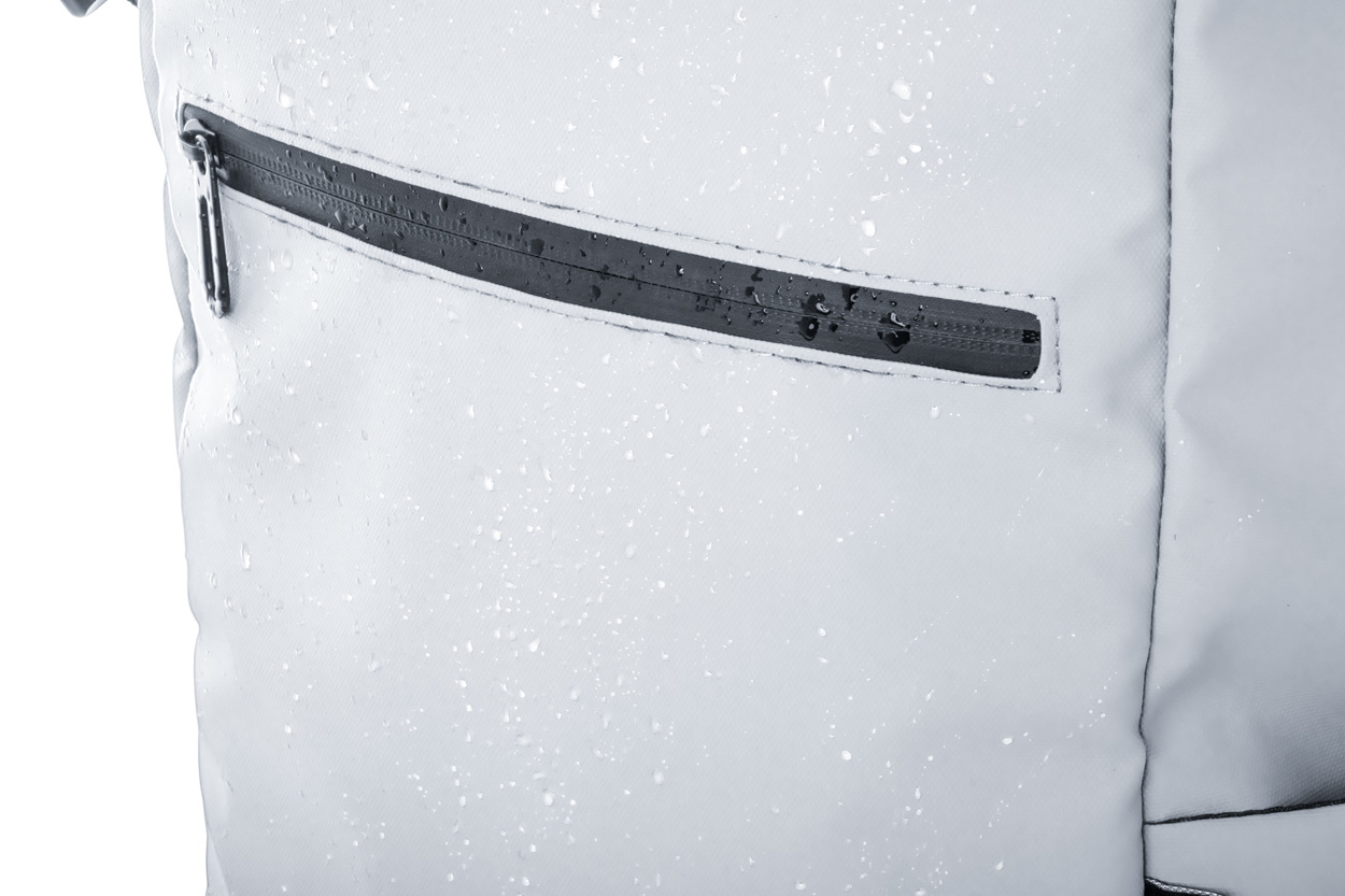 • vodotěsný rolovací batoh z RPET se zapínáním na přezku a suchý zip, polstrovaná přihrádka na notebook (16") a tablet (10"), přední kapsa na zip, boční kapsy, polstrovaná záda a ramenní popruhy, polyester 600D RPET potažený PU, s výrazným štítkem RPET
