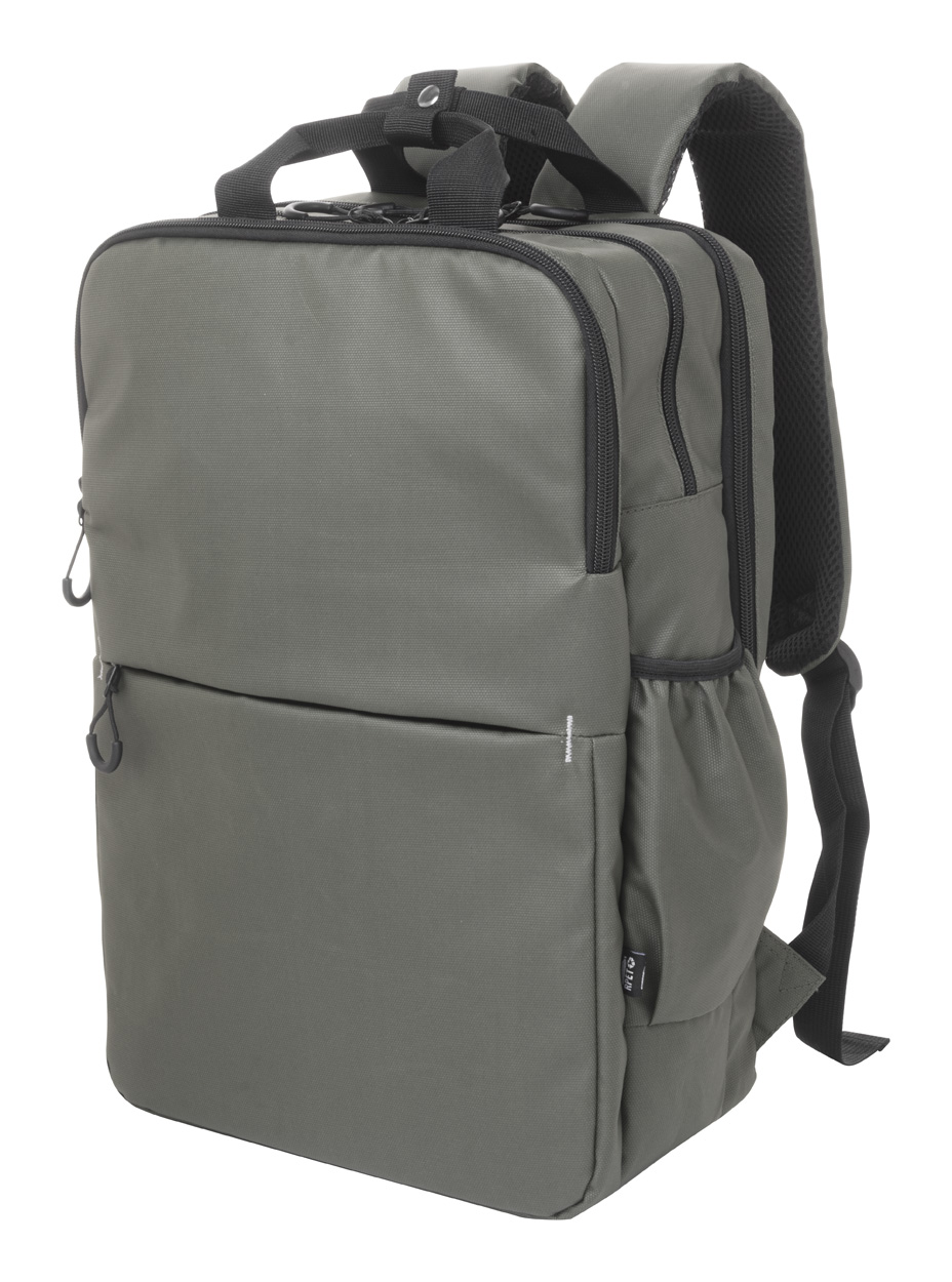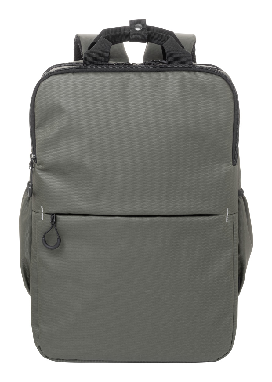 • vodotěsný batoh RPET se 2 přihrádkami na zip, 2 předními kapsami na zip, bočními kapsami a polstrovanou přihrádkou na notebook (16"), s popruhem na vozík, polstrovanými zády a ramenními popruhy, polyester 600D RPET potažený PU, s výrazným štítkem RPET