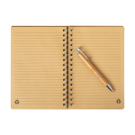 • blok A5 se spirálou v bambusových deskách s 80 linkovanými listy včetně kuličkového pera z bambusu s černou náplní, v kraftové papírové krabičce