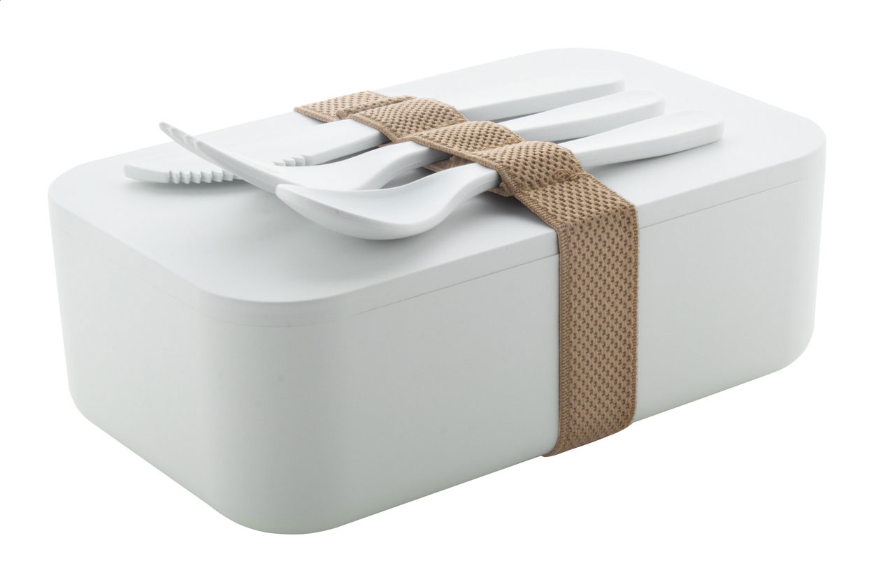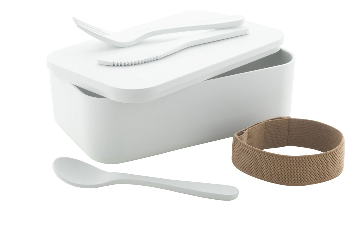 • Box na jídlo z plastu PLA se sadou příborů (vidlička, lžíce a nůž) a polyesterovým elastickým páskem RPET, 1000 ml. Bez BPA, 100% kompostovatelný PLA.