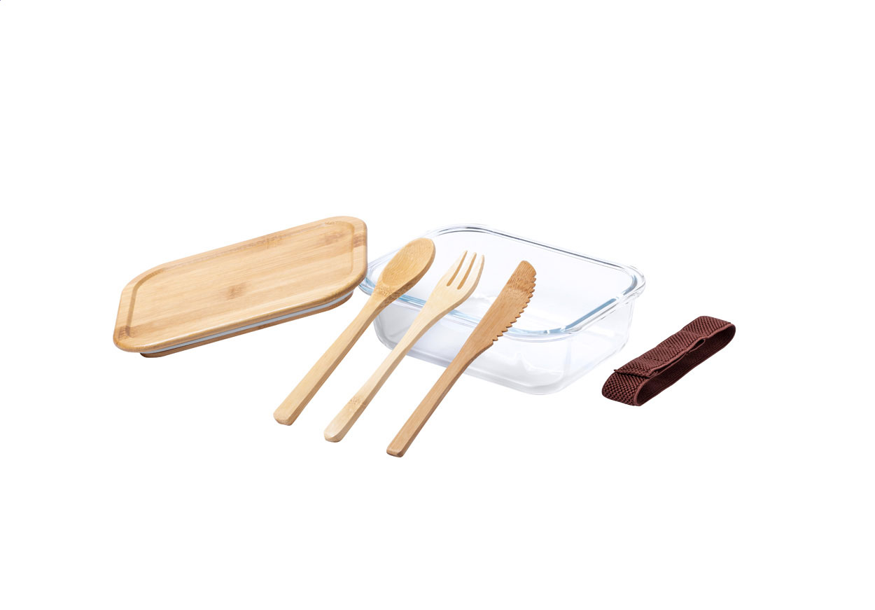 • Skleněný box na jídlo s víkem z přírodního bambusu. Se sadou příborů z bambusu (nůž, vidlička a lžíce) a elastickým páskem, 500 ml.