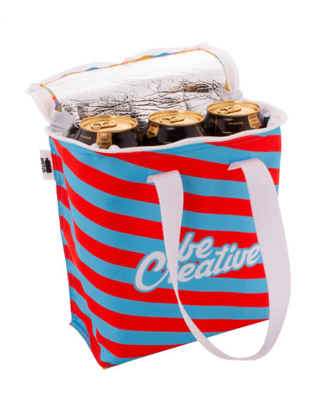 • na zakázku vyrobená chladicí taška na zip z 600D RPET polyesteru s hliníkovou výplní pro 6 ks 0,33 l plechovek, s celoplošně tištěnou sublimační grafikou a výrazným štítkem RPET