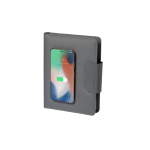 • polyesterová sloha na dokumenty A5 z 300D RPET se zápisníkem na 65 řádků, vestavěnou magnetickou bezdrátovou rychlonabíječkou (10W), power bankou 5000 mAh s portem pro nabíjení USB a skládacím držákem na mobil, včetně samolepícího kovového kroužku pro použití magnetické funkce na jakémkoli bezdrátově nabíjecím zařízení, včetně USB nabíjecího kabelu