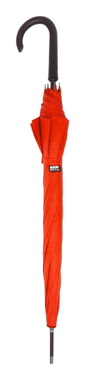 • Automatický větruodolný deštník s 8 panely, sklolaminátovým rámem, kovovou tyčí a zakřivenou ABS rukojetí. Pongee 190T RPET. S výrazným štítkem RPET.