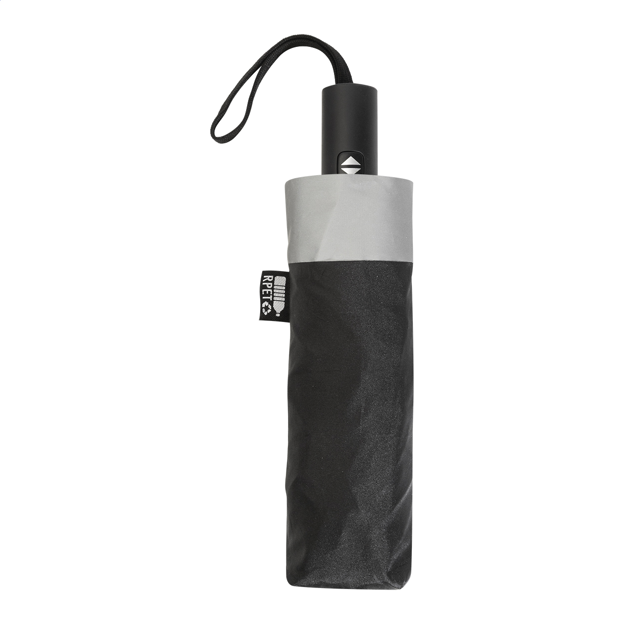 • Velký, plně automatický (otevřít/zavřít) větruodolný skládací deštník se 4 panely z 190T RPET pongee a 4 panely z reflexní tkaniny. S kovovým rámem, žebry ze skelných vláken a pogumovanou rukojetí s poutkem na ruku. 190T RPET pongee. S charakteristickým štítkem RPET.