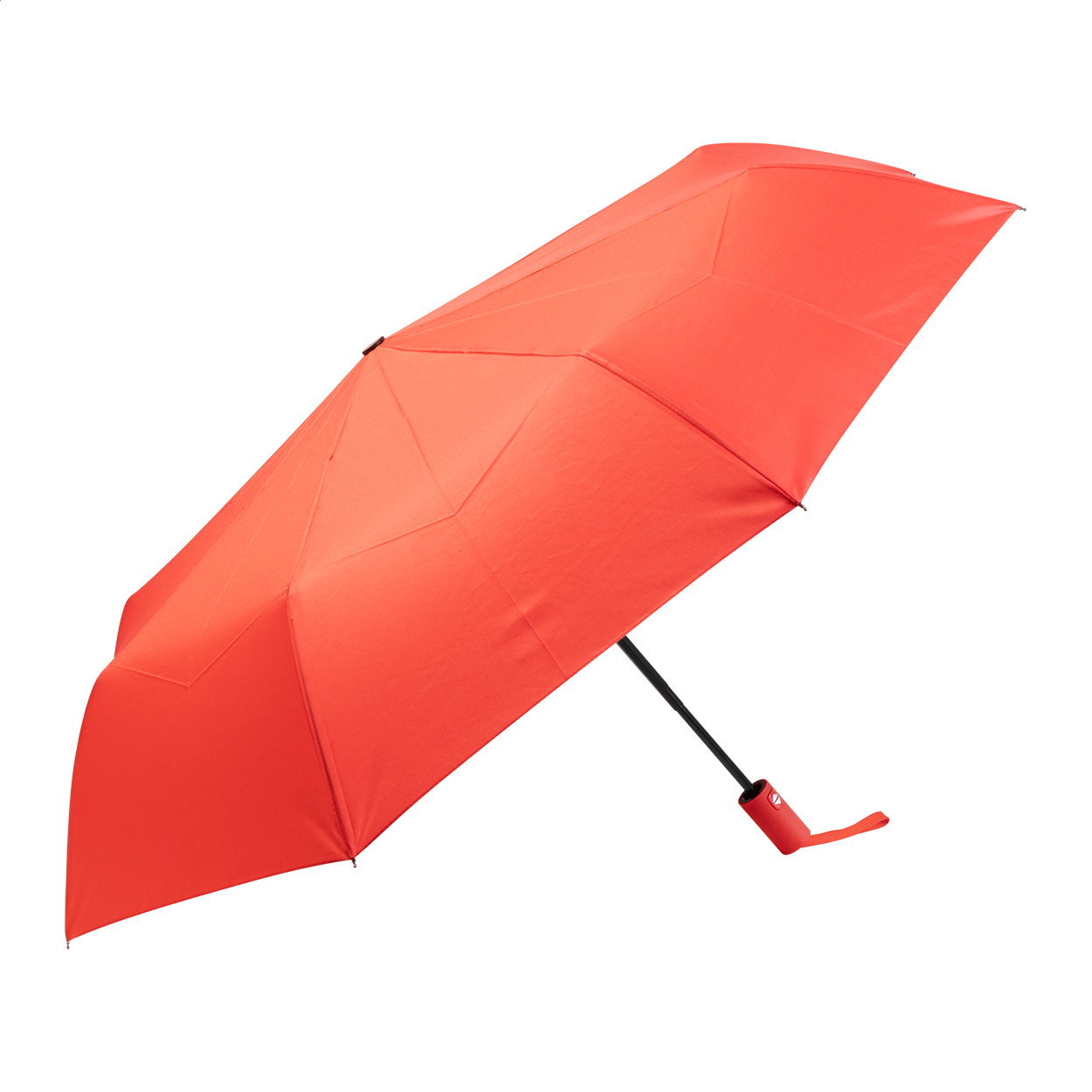 • Plně automatický (otevřít/zavřít), větruodolný skládací deštník s 8 panely v pouzdře ve stejné barvě. S kovovým rámem, sklolaminátovými žebry a pogumovanou rukojetí. Pongee 190T RPET. S výrazným štítkem RPET.