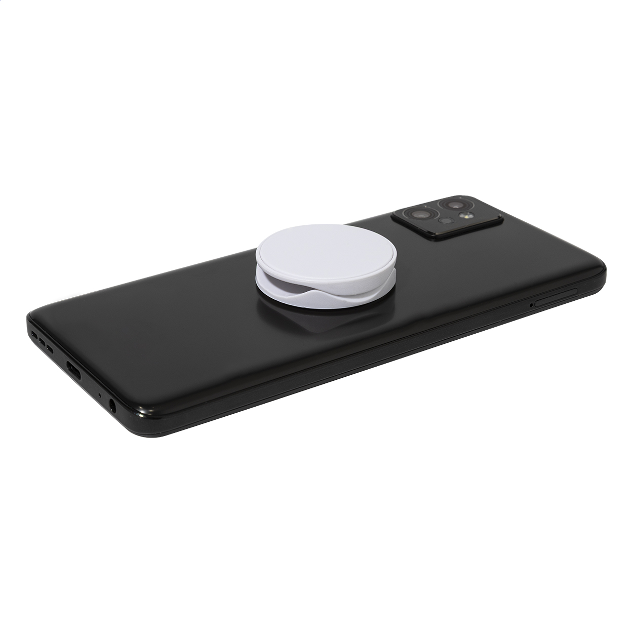 • Kulatý držák na mobil z recyklovaného ABS se samolepicí základnou.