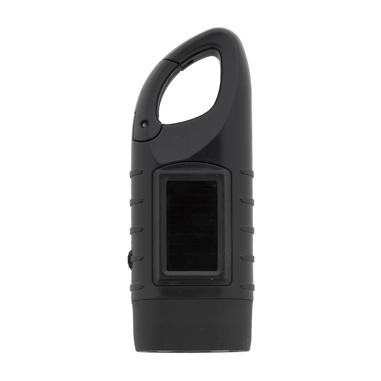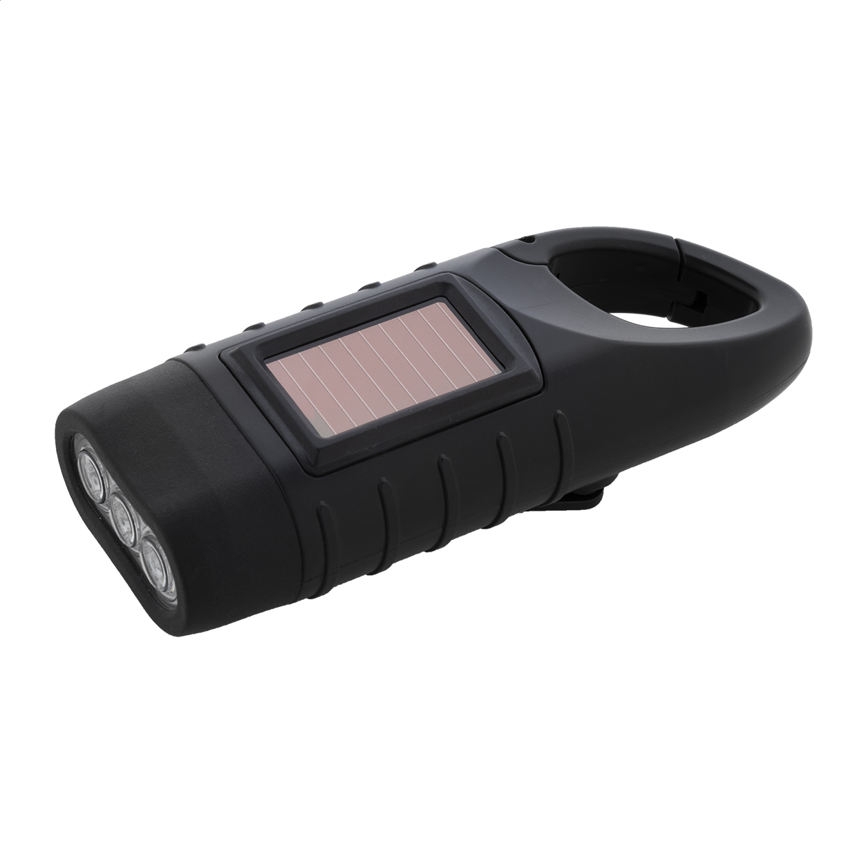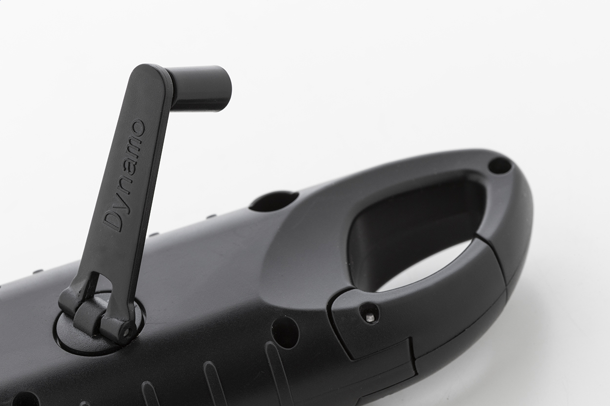 • Baterka z recyklovaného ABS plastu se 3 LED diodami, vestavěnými solárními a dynamovými nabíječkami a karabinou.