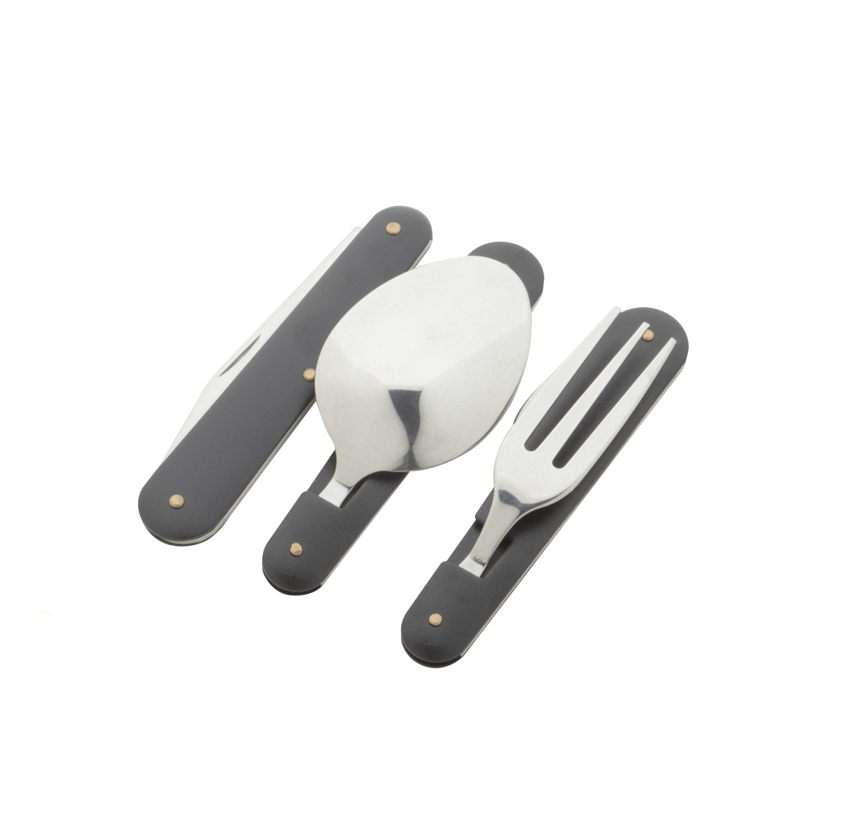 • skládací kempingová příborová sada z nerezové oceli s hliníkovými držadly, 300D polyester, včetně vidličky, nože a lžíce v černém obalu
