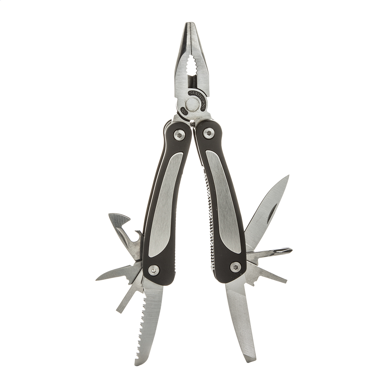 • Multifunkční kleště z nerezové oceli s 9ti funkcemi: kleště, pilník, 3 šroubováky, 2 velikosti nožů, otvírák na plechovky a pilka. Dodáváno s polyesterovým pouzdrem.