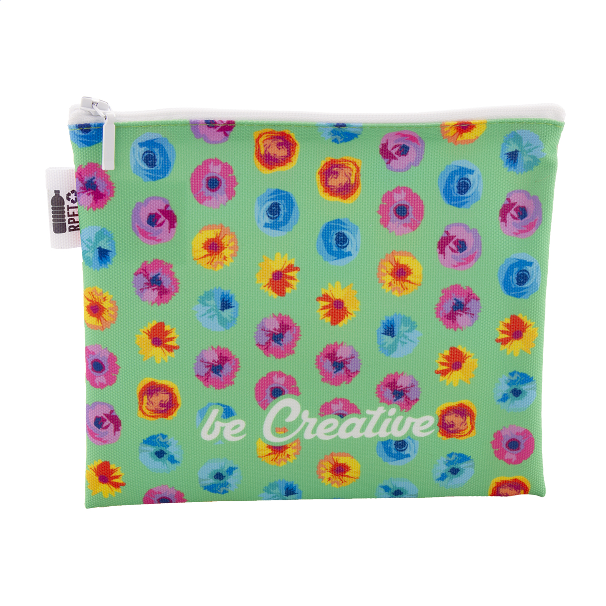 • Na zakázku vyrobená kosmetická taštička na zip z 600D RPET polyesteru. S celoplošně tištěnou sublimační grafikou, nezahrnuje tiskovou přípravu.