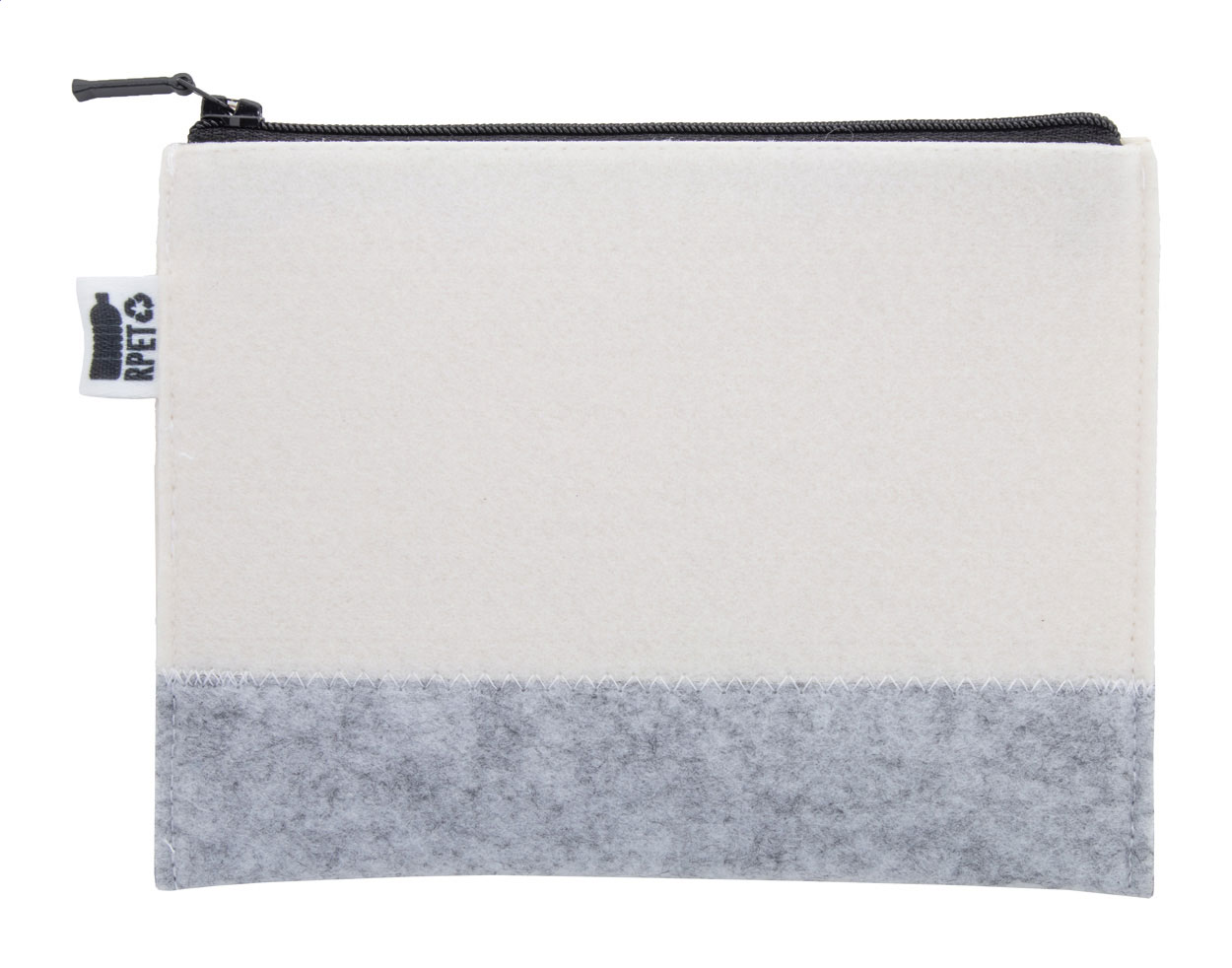 • Na zakázku vyrobená kosmetická taštička na zip z RPET plsti s celoplošně potištěnou sublimační grafikou. S výrazným štítkem RPET.