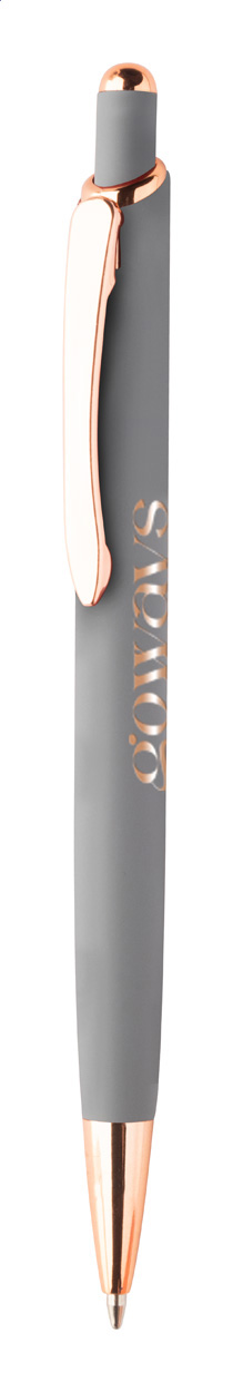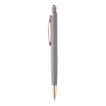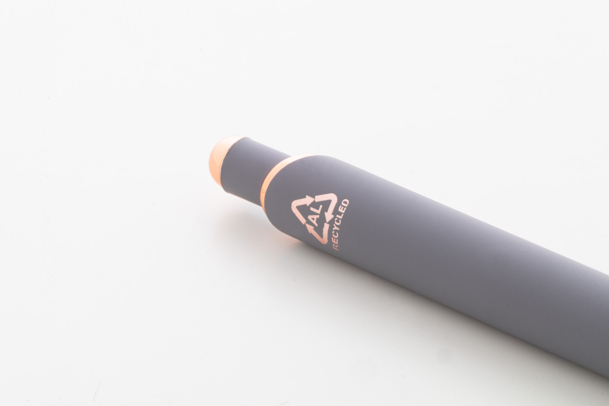• kuličkové pero z recyklovaného hliníku s pogumovaným povrchem a detaily z růžového zlata, se speciální povrchovou úpravou pro zrcadlové laserové gravírování v barvě růžového zlata, s modrou náplní