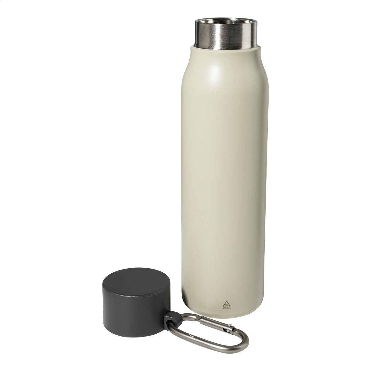 • Dvoustěnná vakuová láhev z recyklované nerezové oceli s víčkem z PP a karabinou z recyklovaného hliníku, 500 ml