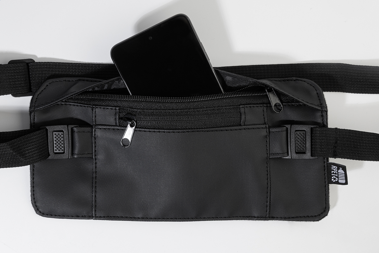 • Úzká ledvinka z RPET s přední stranou potaženou PU, přihrádkou na zip a přední kapsou a nastavitelným popruhem. Polyester 600D RPET s PU zátěrem a výrazným štítkem RPET.