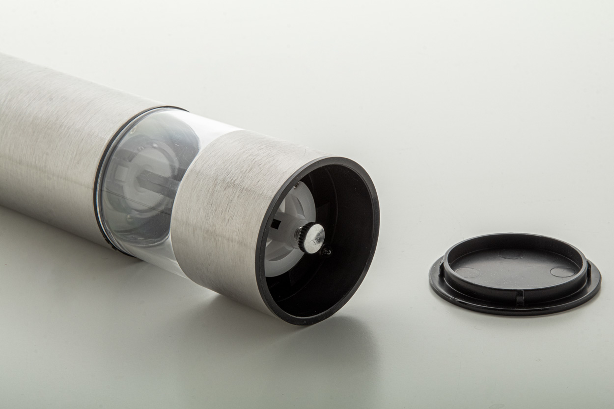 • Nerezový elektrický mlýnek na sůl a pepř s keramickým jádrem mlýnku a LED osvětlením. Funguje na 4 AA baterie, bez baterií.