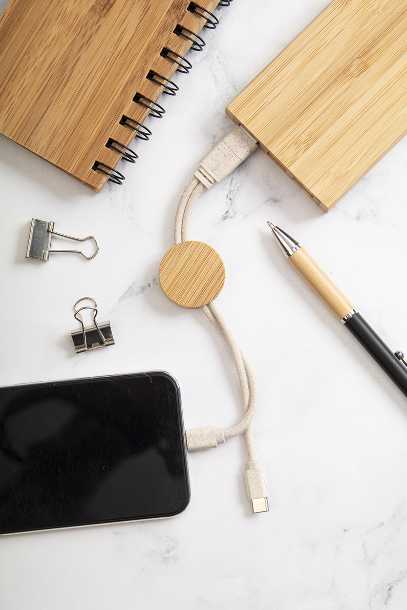 • Přívěšek na klíče USB nabíjecí kabel z ekologického plastu z pšeničné slámy a bambusu. S konektory micro USB, USB-C a Lightning. Se vstupy USB a USB-C.