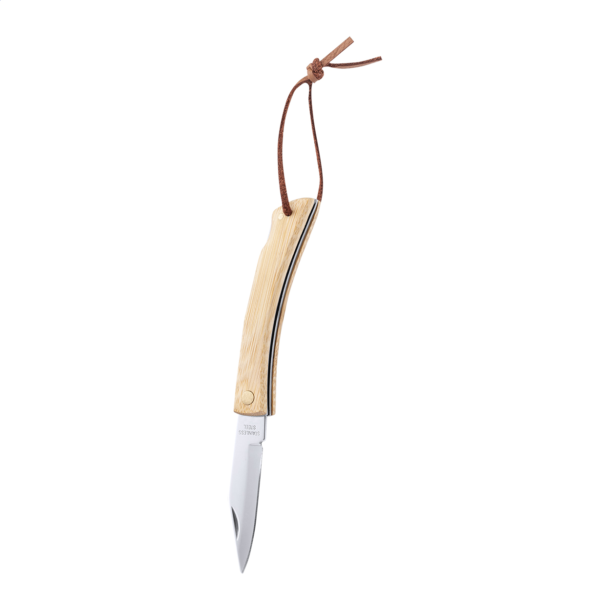 • Kapesní nůž z nerezové oceli s bambusovou rukojetí a páskem z PU kůže. S bezpečnostní pojistkou.