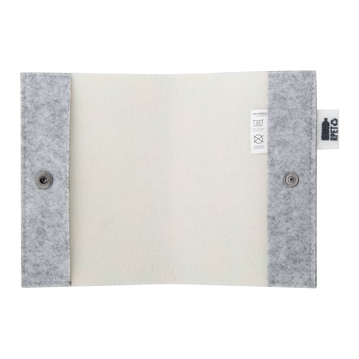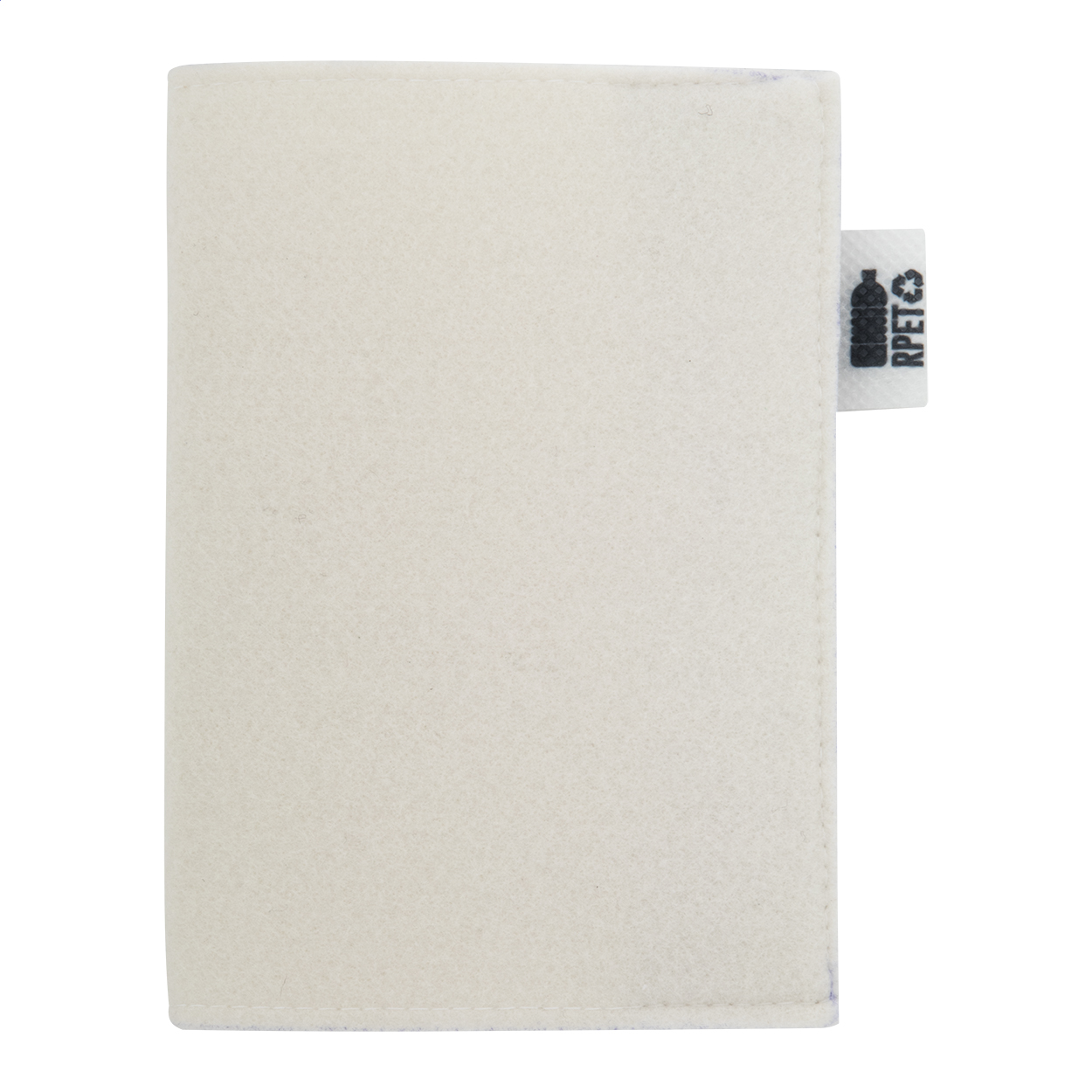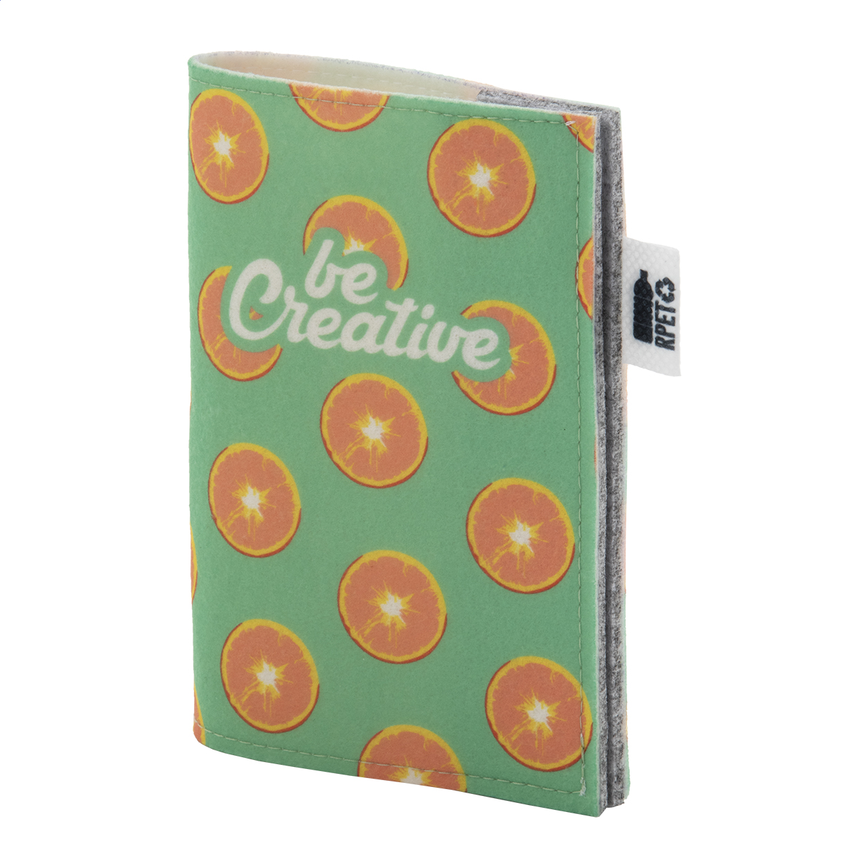 • Na zakázku vyrobené RPET plstěné pouzdro na pas s plnobarevným potištěným krytem a zapínáním na druky. S výrazným štítkem RPET.