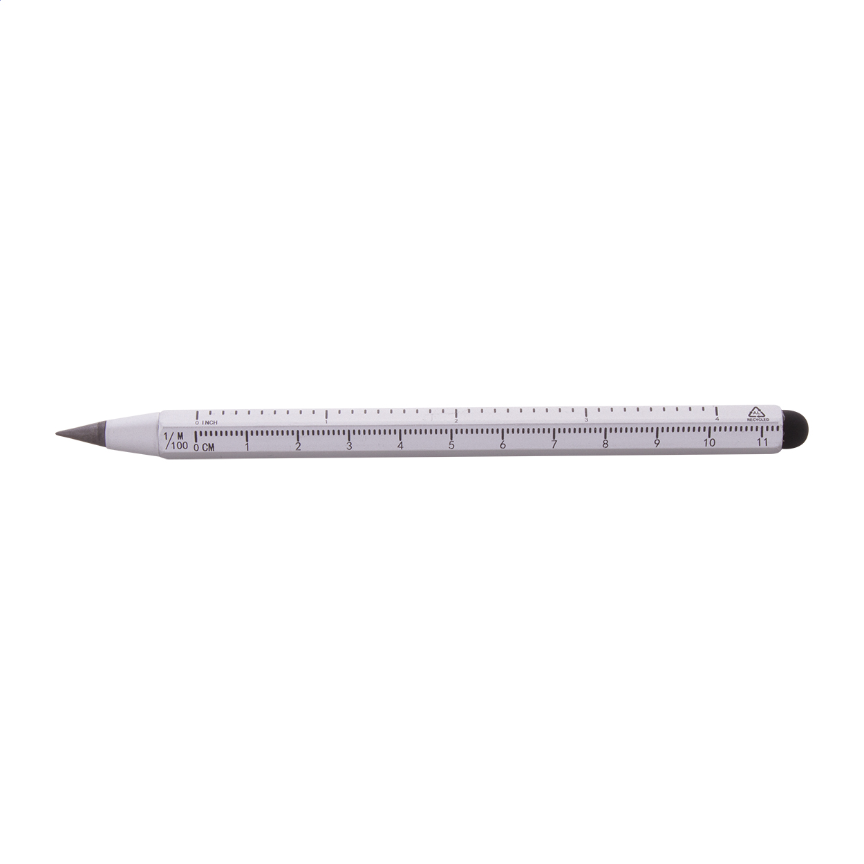 • Bez inkoustové pero s dlouhou životností z recyklovaného hliníku s dotykovým stylusem a hrotem z kovové slitiny, který oxiduje papír. S šestihrannou hlavní včetně pravítek 11 cm a 4 palce. Toto pero píše podobně jako tužka a navíc je stíratelné.