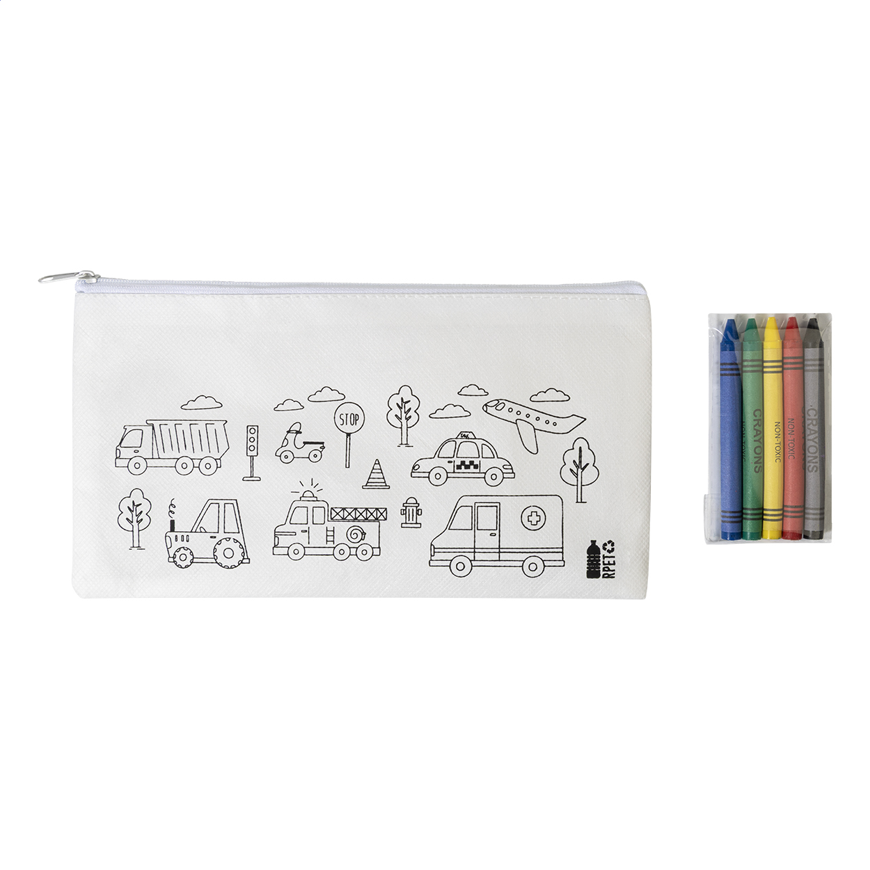 • Pouzdro na pera se zipem z netkané RPET tkaniny s 5 voskovkami na vybarvení.