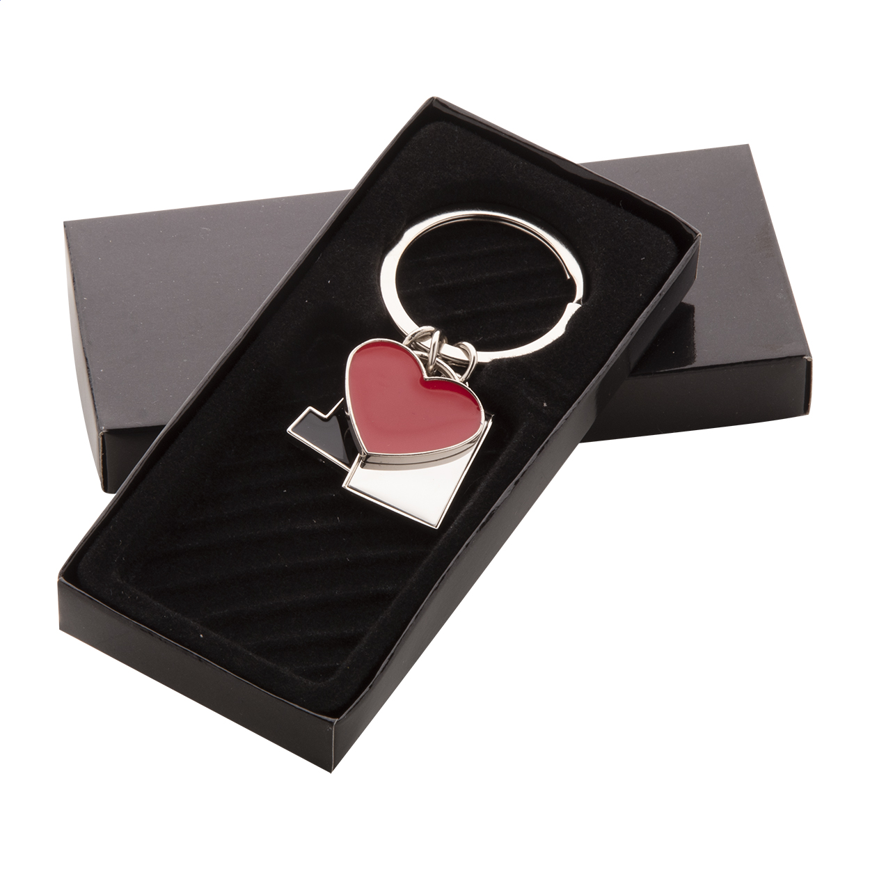 • Kovový přívěšek na klíče se 3 přívěšky: "Já", srdce a obdélník. V černé dárkové krabičce.