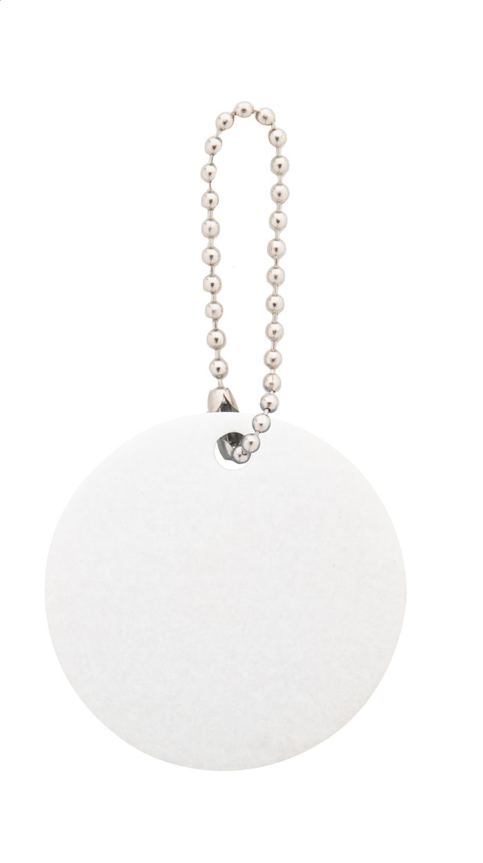 • Na zakázku vyrobený přívěsek na klíče z RPET plsti s kovovým řetízkem a plnobarevným potiskem.