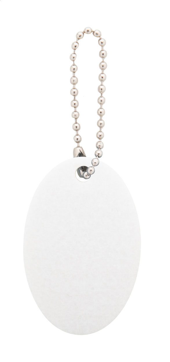 • Na zakázku vyrobený přívěsek na klíče z RPET plsti s kovovým řetízkem a plnobarevným potiskem.