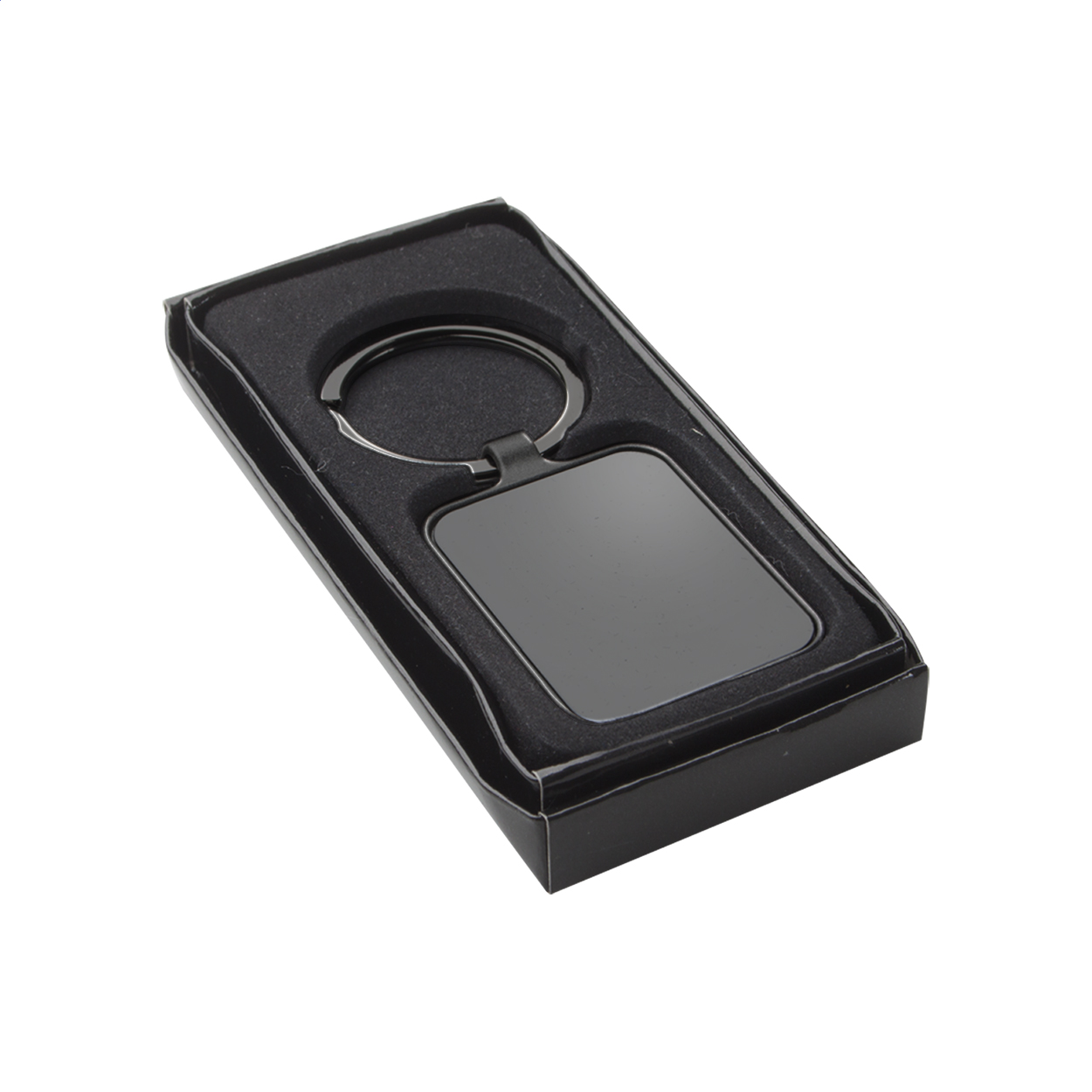 • Obdélníkový přívěšek na klíče v barvě gun metal s oboustranným lesklým povrchem.