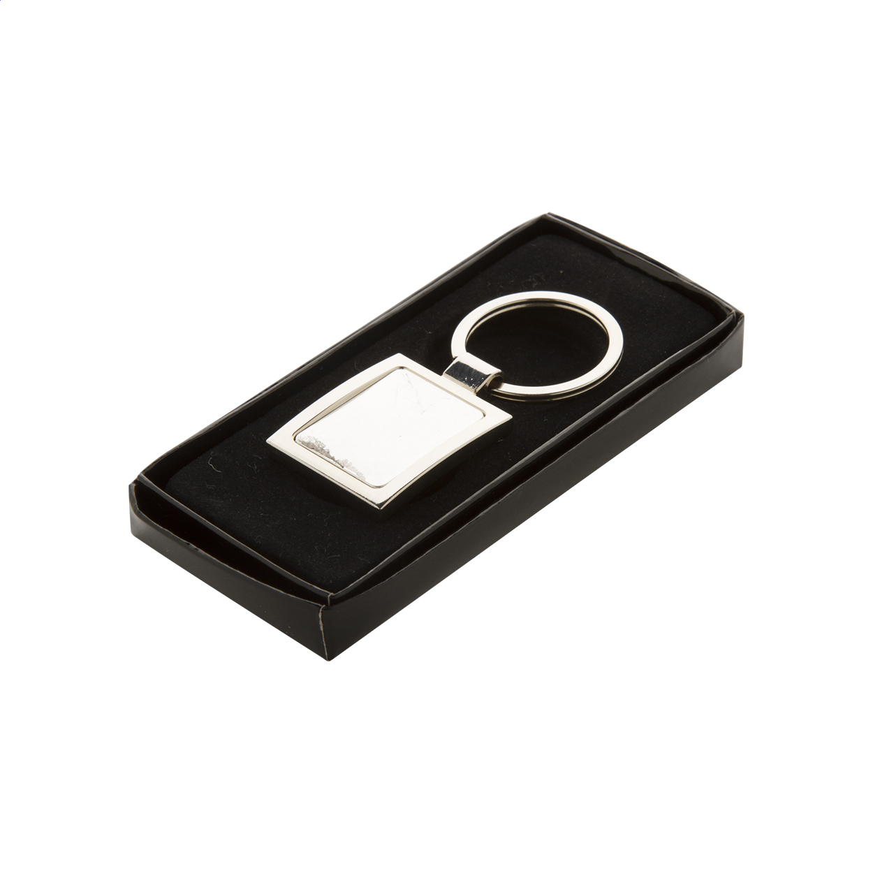 • Kovový přívěšek na klíče v krabičce z černého kartonu.