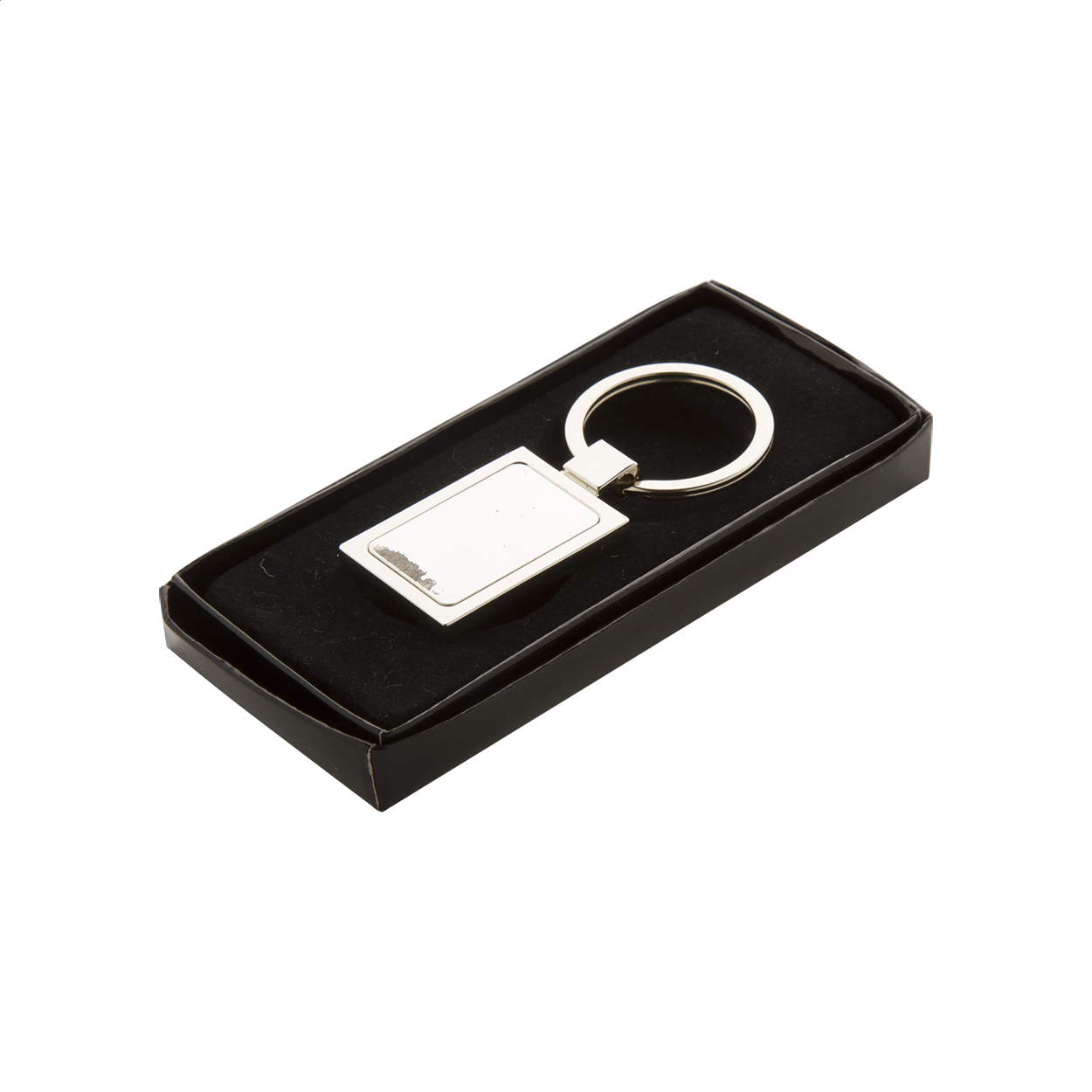 • Kovový přívěšek na klíče v krabičce z černého kartonu.